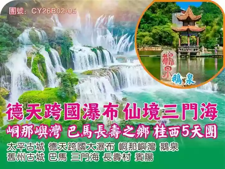 德天跨國瀑布 仙境三門海 巴馬長壽之鄉 5天高鐵團