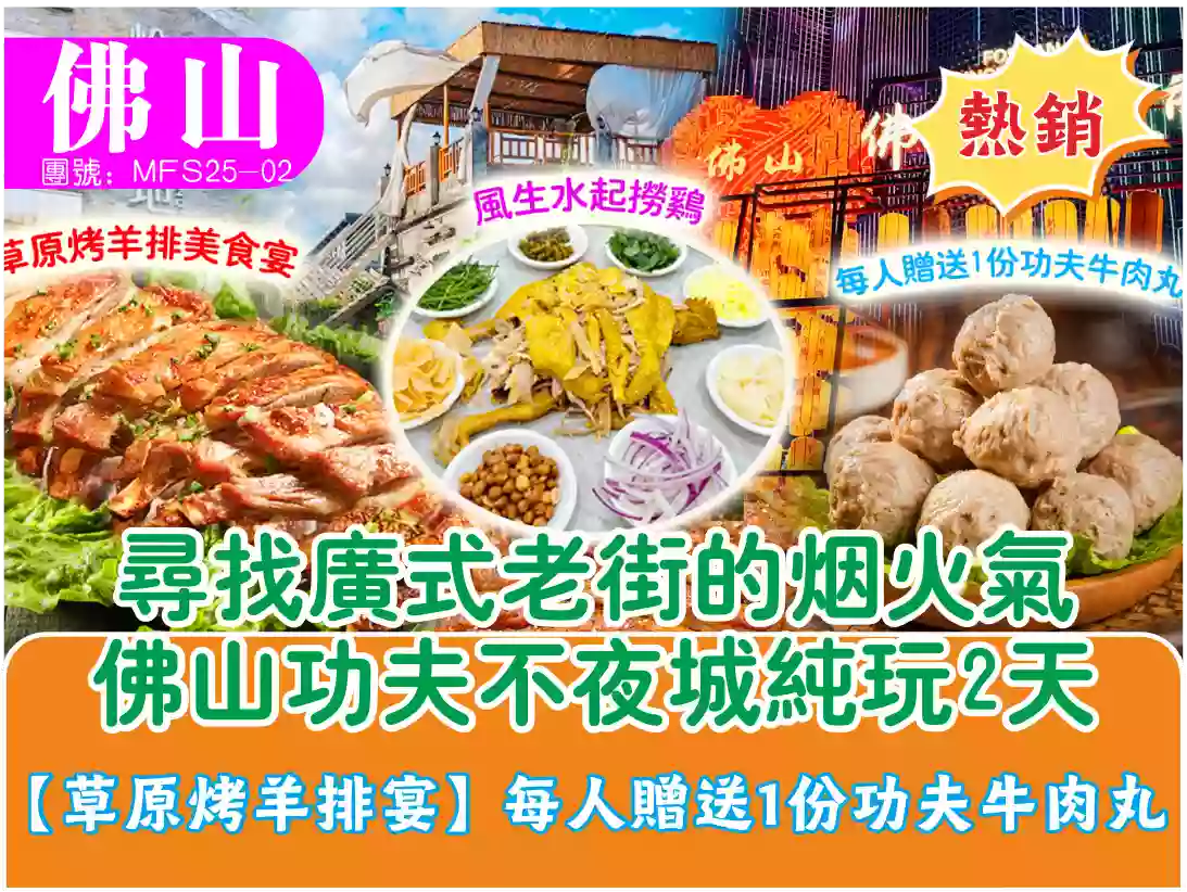 熱銷佛山功夫夜市+草原烤羊排宴2天純玩團(每人送1份牛肉丸)