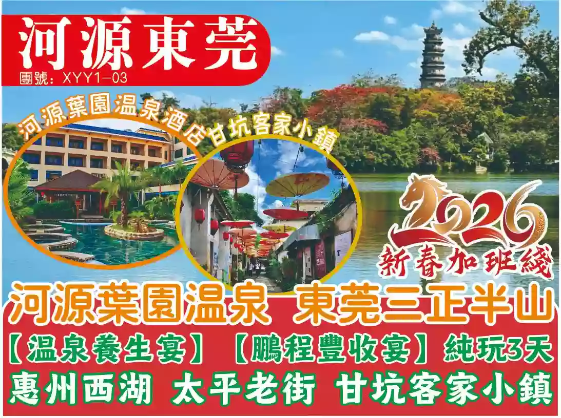 河源葉園溫泉+東莞三正半山酒店自助晚餐3天純玩團