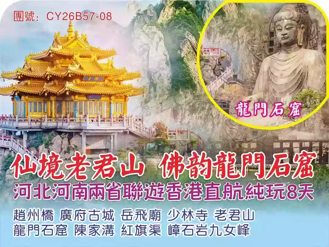 仙境老君山 佛韵龍門石窟 河北河南兩省联遊香港直航纯玩8天