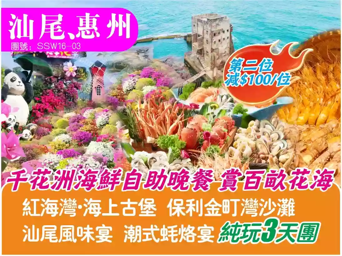 (第二位減$100)汕尾海上古堡 惠州千花洲海鮮自助晚餐3天純玩團